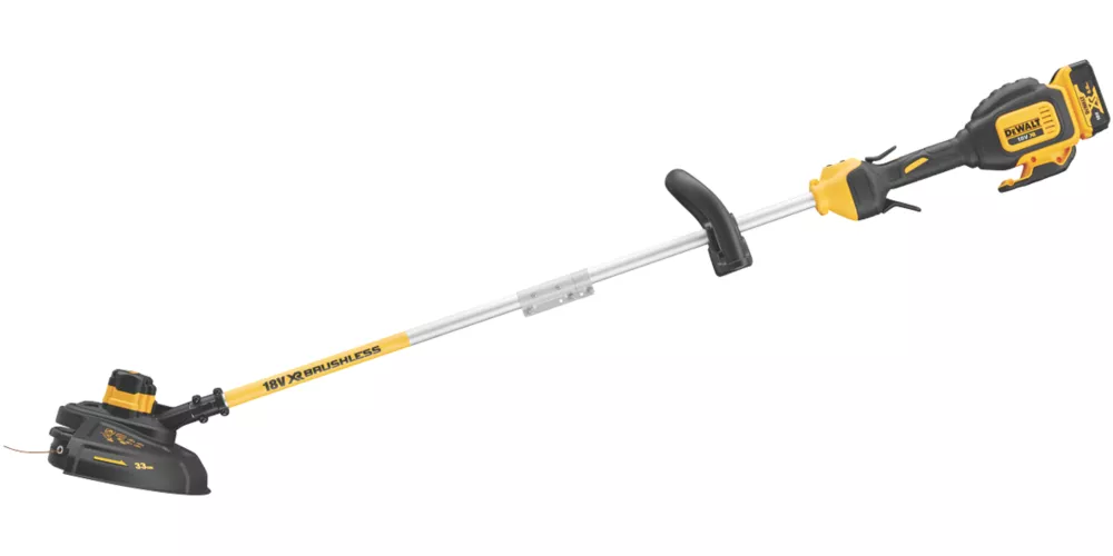 Cordless trimmer with a 2-speed fully variable trigger offering total power control. Features 400MWO brushless motor gear drive design that provides extra torque and maintains cut speed under load. Professional style guard improves access and visibility. Supplied with a 5.0Ah Li-ion battery and charger.