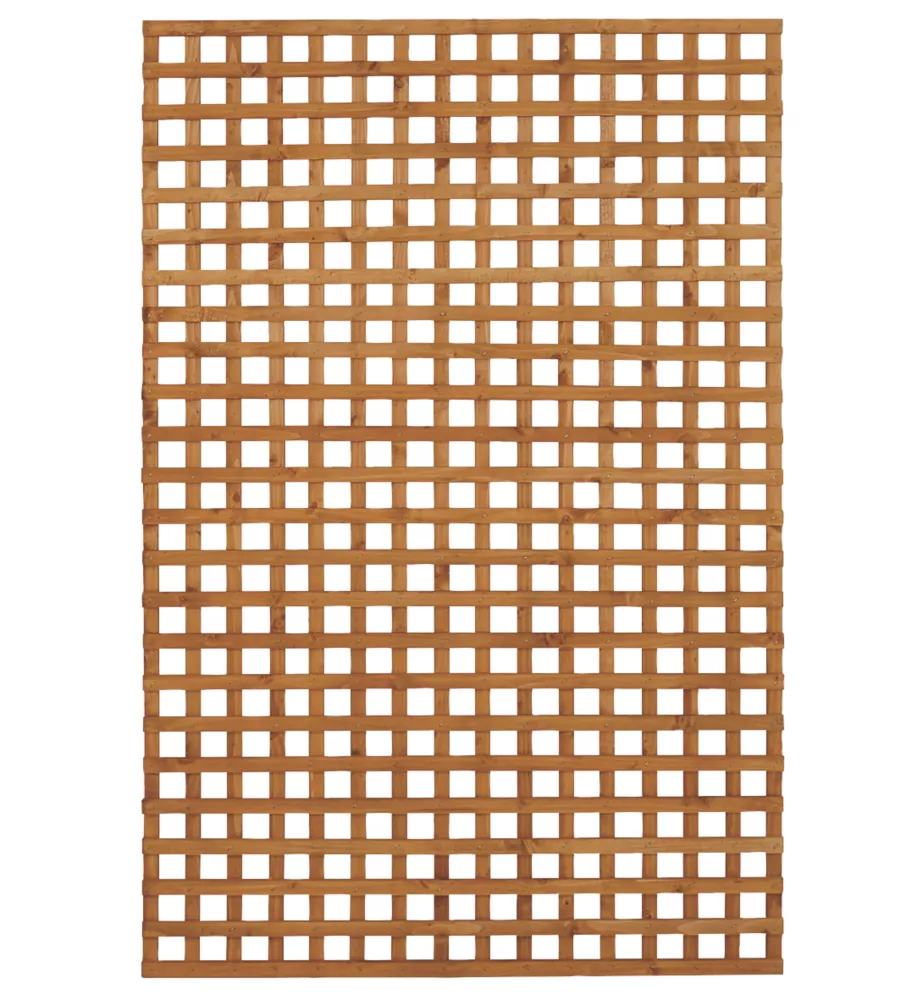 Contemporary, smooth-planed square trellis with 15mm thick by 30mm wide battens which give plenty of room for climbing plants to weave between. Dip-treated with a preservative to protect it from rot and give it a golden brown colour.