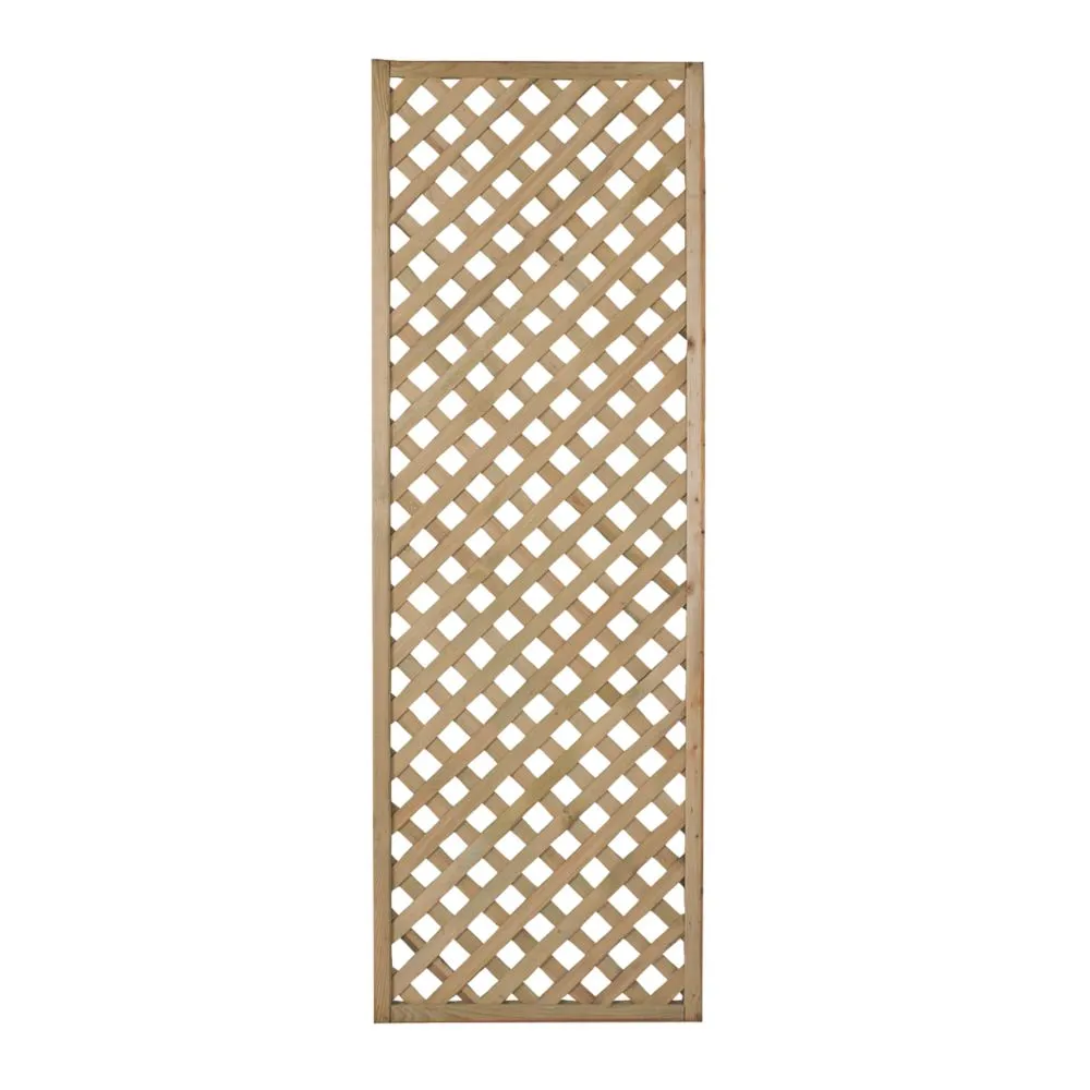 Pressure-treated decorative trellis with an attractive diamond pattern. Features square-edged, smooth-planed battens that are 6mm thick and 30mm wide. Battens are overlaid and mounted in a substantial rebated perimeter frame (also smooth-planed). Designed primarily for mounting to an external wall, or fence, to create a garden feature that can support climbing plants.