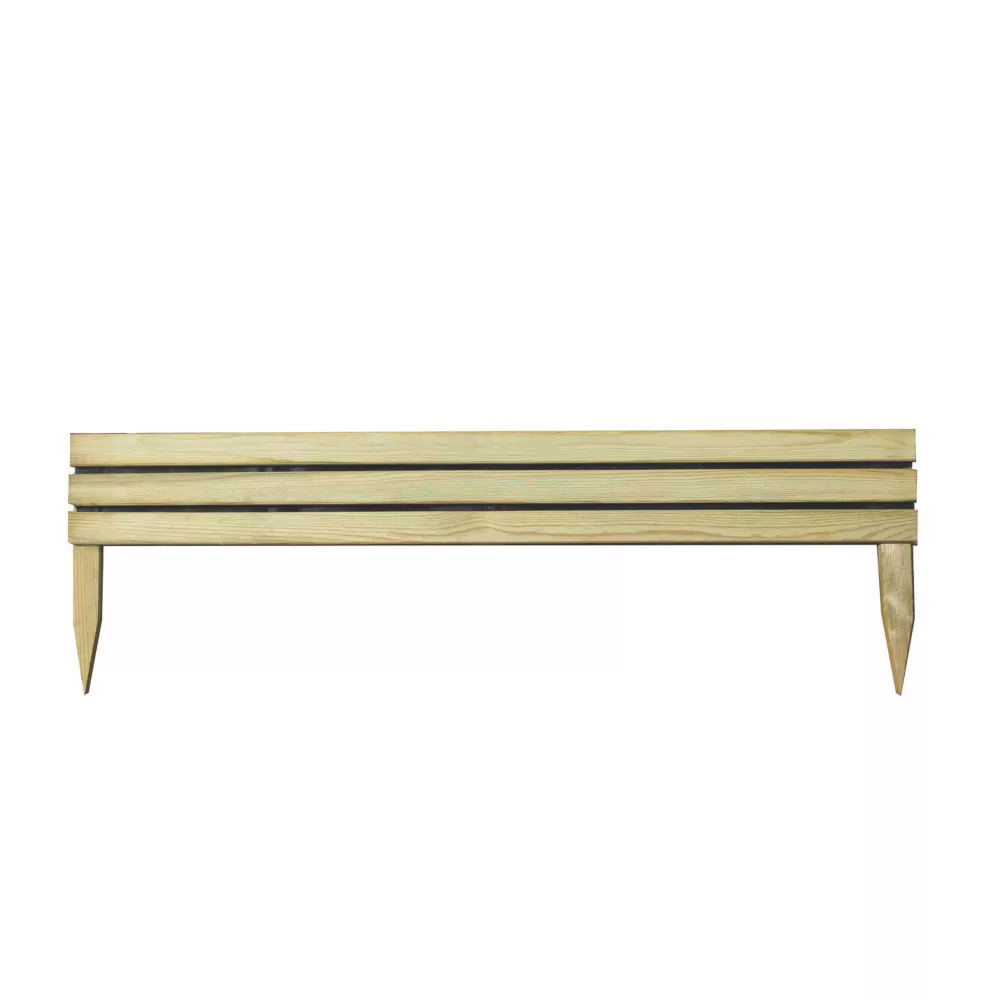 Modern alternative to the more conventional and traditional log and picket edging. Pressure-treated to protect against rot. Simple clean lines give a contemporary effect for edging borders or defining front garden boundaries and driveways. Comes complete with integral spikes for sinking into soft ground and also a pre-fitted black liner which helps define the slatted effect. The slats are 15cm high and with the spikes this makes a total height of 34cm.