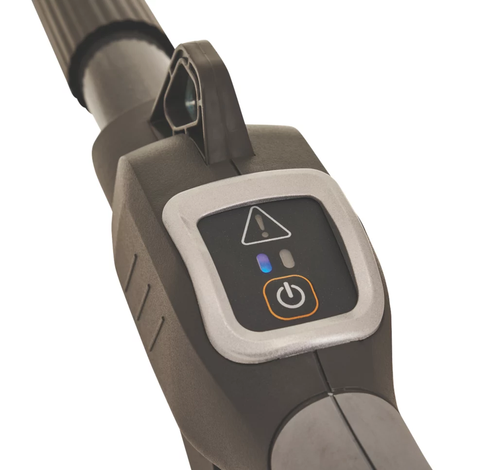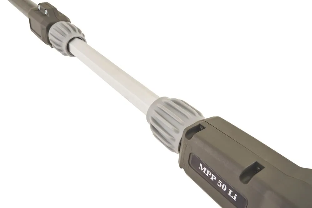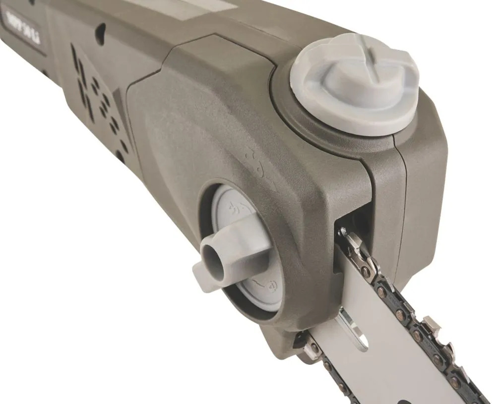 Long-reach pruner with a brushed motor and a cutting bar with high performance chain. Features a 65cm telescopic extension shaft capable of reaching up to 4m for hard to reach pruning jobs. Cutting attachment with integrated bumper to lean against branches for a precise cut. Electronic control panel for easy use. Battery and charger available separately.