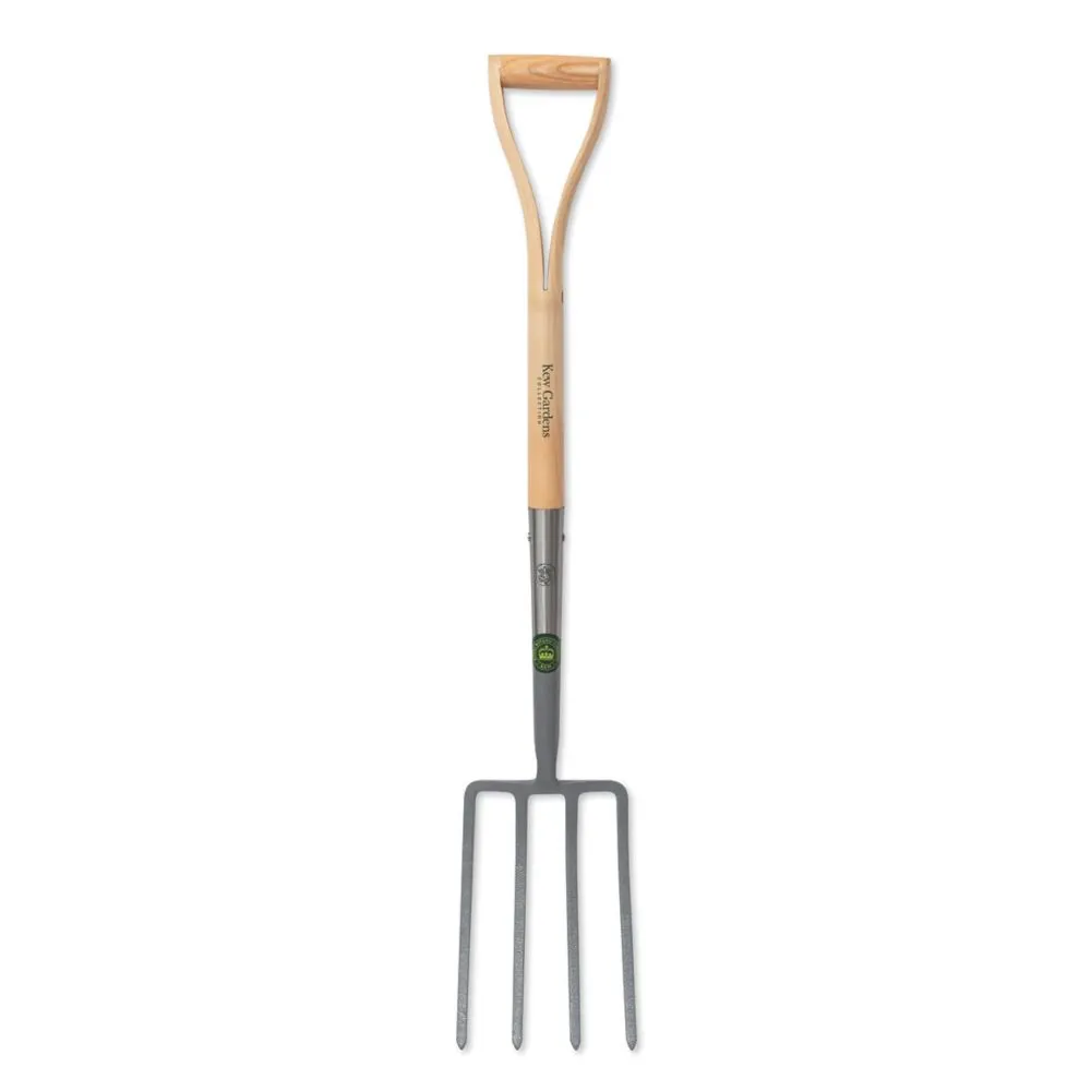 Exceptionally strong and built to last carbon digging fork. Solid-forged from a single piece of steel, making it ideal for digging over and breaking up soil. Hammer finished powder coating improves resistance to rust, humidity and soil alkalis. Ashwood weatherproof handle. Longer socket and handle reduces the need for bending and helps against back strain. Double width treads for more comfortable digging.