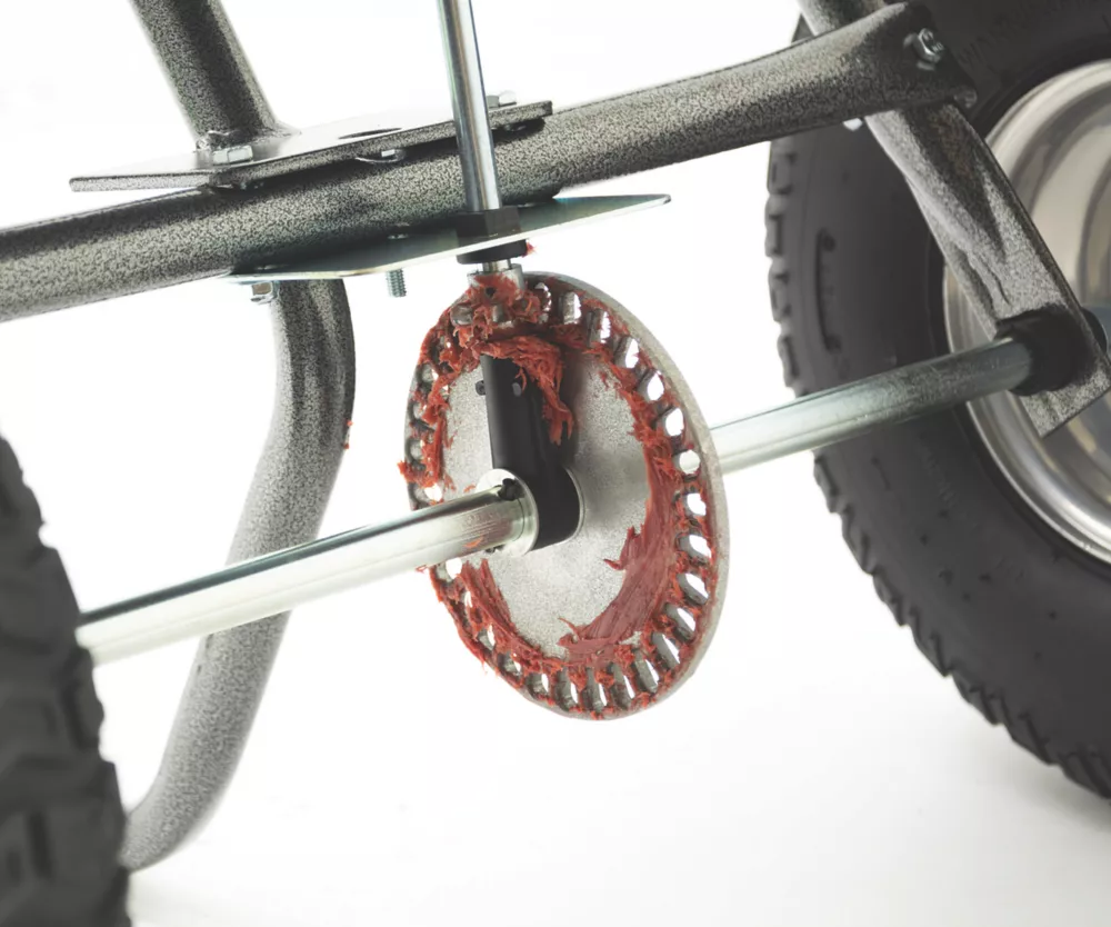 Large spreader with non-corrosive poly hopper for maximum coverage on large areas. Pneumatic wheels for easy transportation. Ideal for fertilizer, granules, grass seed and winter salt.