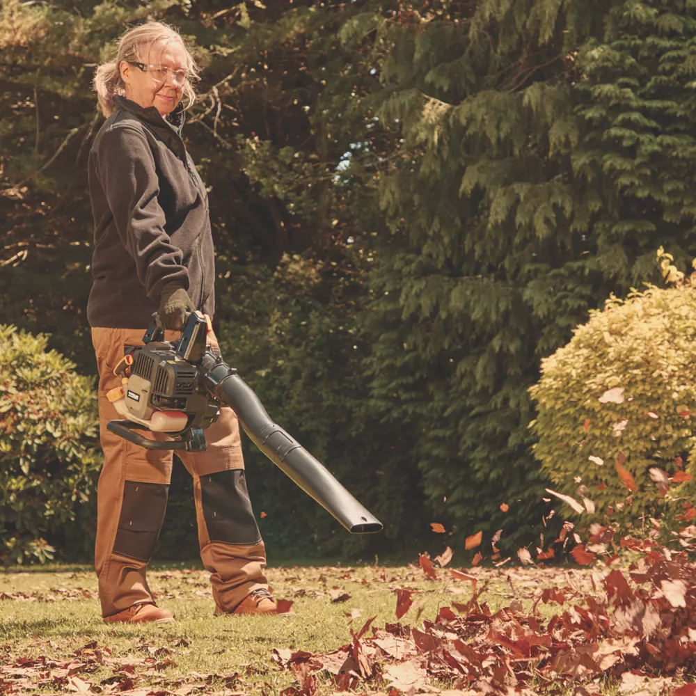 Lightweight, compact blower vacuum for clearing and cleaning ground with minimum effort. Dry leaves can be crushed to 1/12 of original size. Offers blowing, vacuuming and mulching functions. Features throttle with cruise control and Easy-Start technology, reducing the pulling effort required for starting.
